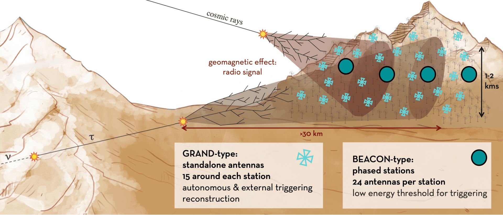 The second technique involves 360 more widely distributed autonomous stations (inspired by the approach of the GRAND project), deployed along a mountainside at elevations between approximately 1,000 and 2,000 meters above sea level.