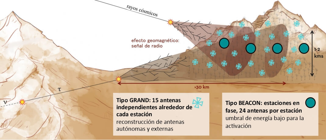 La segunda técnica consiste en 360 estaciones autónomas, más dispersas (inspiradas en el enfoque del proyecto GRAND), que estarán emplazadas en una ladera de entre 1000 y 2000 metros sobre el nivel del mar, aproximadamente.